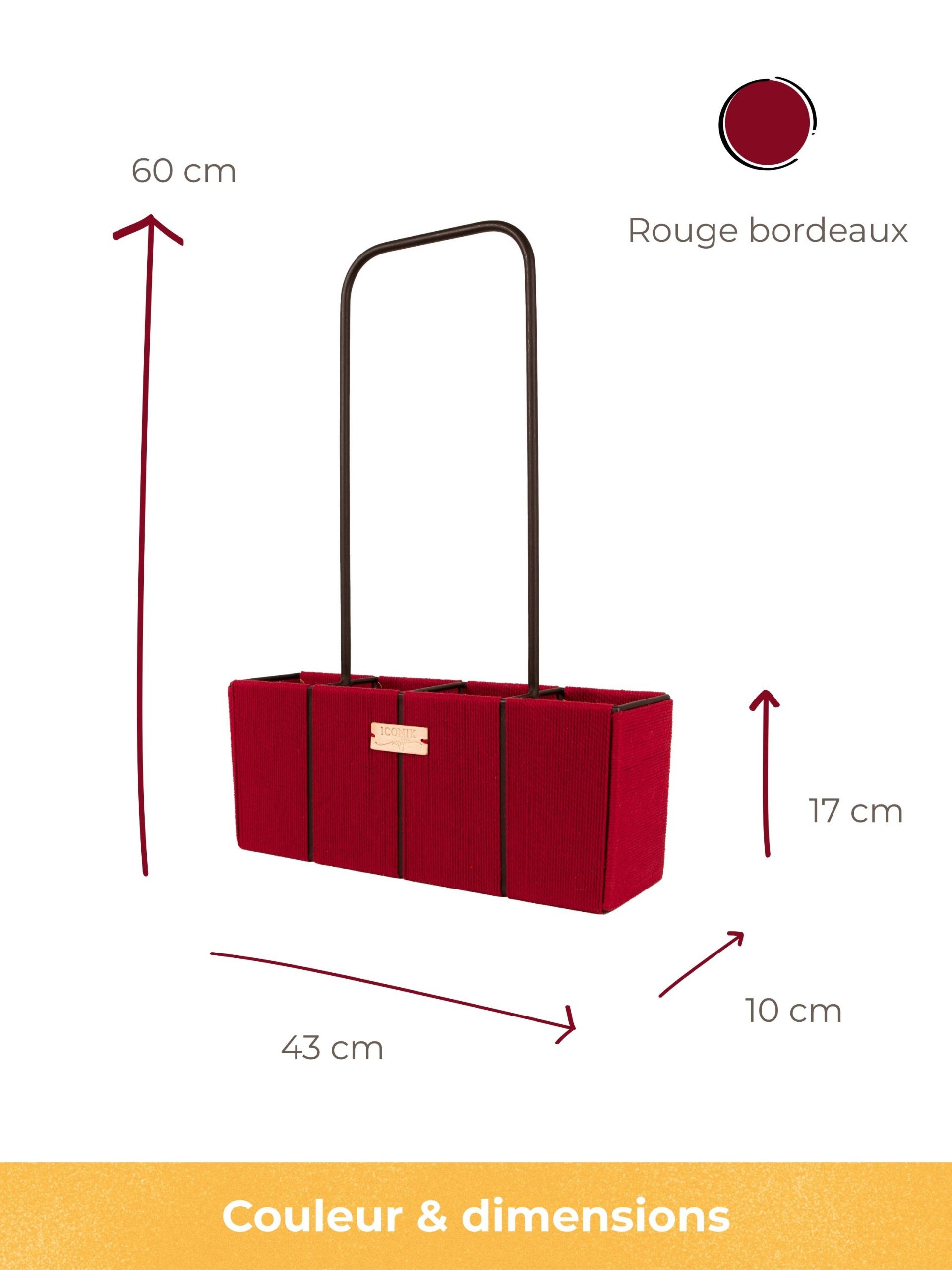 Il est 100 % fabriqué à la main par nos artisans : de sa structure en fer brossé noir à son tressage en fil de coton rouge bordeaux et ses finitions raffinées. Ce qui fait de chaque panier une pièce unique.